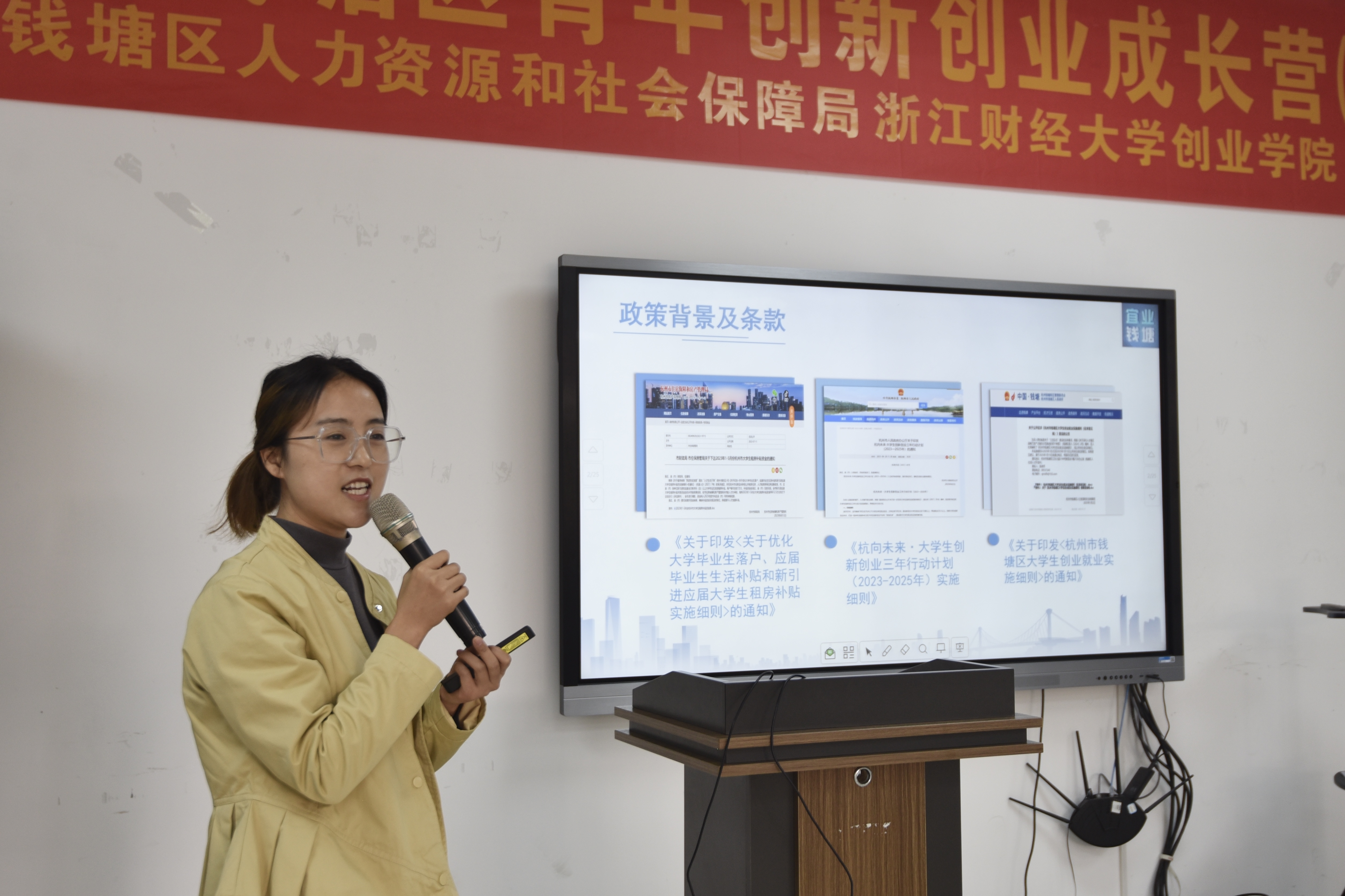 首先,创业学院专聘副院长林建林为成长营致开场词。随后,钱塘区人才开发科郑益玲为学员带来详尽的大学生创业就业政策解读,为就业创业提供指导。